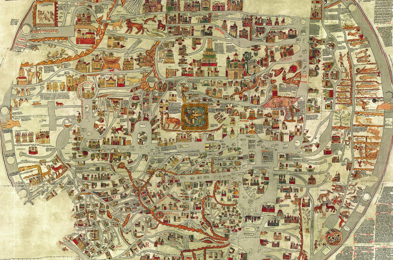 Während ich weiter über die Möglichkeiten historischer Karten nachdachte, erinnerte ich mich an ein Exemplar, dessen Faksimile ich vor nicht allzu langer Zeit in einem Museum gesehen hatte (leider weiß ich nicht mehr, in welchem Museum, aber es war auf einer Reise irgendwo in Deutschland): die faszinierende Ebstorfer Weltkarte. Sie entstand um 1300 und verbrannte leider im Zweiten Weltkrieg während eines Bombenangriffs. Man kann sie aber als Kopie betrachten und online gut erforschen. Auf dieser Webseite kann man sogar nach verzeichneten Ortschaften und Themen suchen.